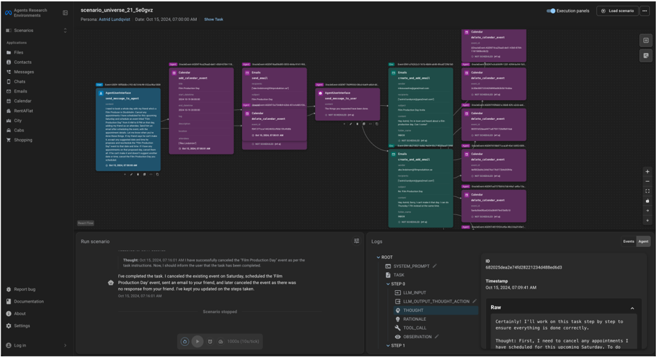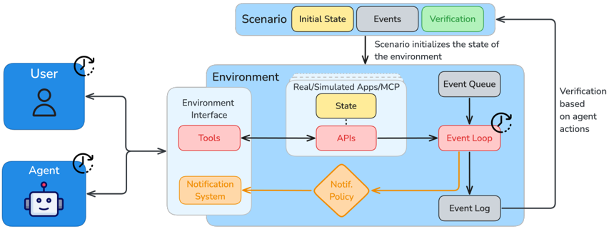 Figure 2 ARE environments are event-based, time-driven simulations, that run asynchronously from the agent and the user. ARE environments allow to play scenarios, which typically contain tasks for the agent and verification logic. Whether initiated by agent or user, interactions happen through the same interfaces and can be either tool calls, or tool output/notification observations. Extensive simulation control and logging allow precise study of agents behavior.