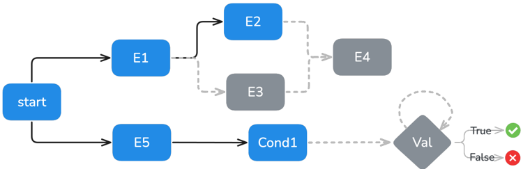 Figure 3 Event dependency graph illustrating ARE scheduling patterns. Events E1 and E5 execute in parallel after simulation start, and E2 E3 / executing in parallel after their prerequisites, both need to be executed for E4 to execute. Conditional execution is shown through Cond1 leading to validation ( Val ) with true/false outcomes.