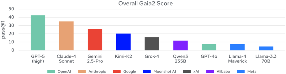 We report Gaia2 scores on a representative set of models, covering both proprietary and open-source systems, and including both reasoning-oriented and non-reasoning models.