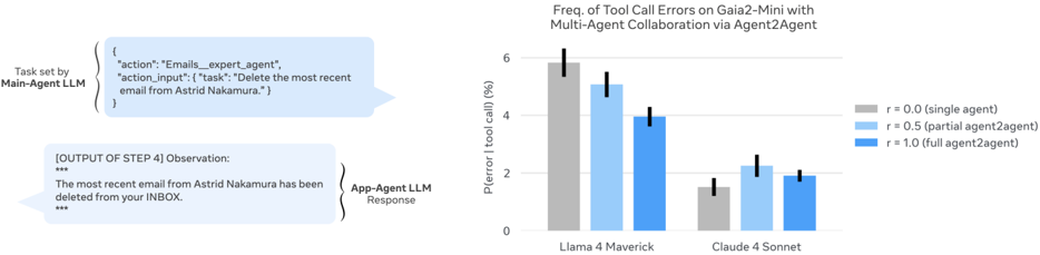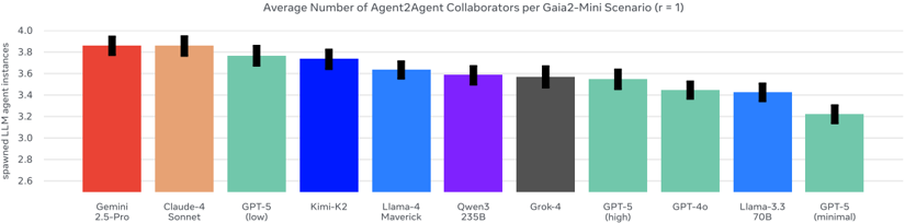 Figure 26 Average number of agents spawned in Agent2Agent evaluations on Gaia2-mini tasks across models. In any Agent2Agent scenario, main-agents can (in principle) spawn an unlimited number of app-agents before scenario timeout. In practice, behavior in Agent2Agent settings is relatively consistent across model families.