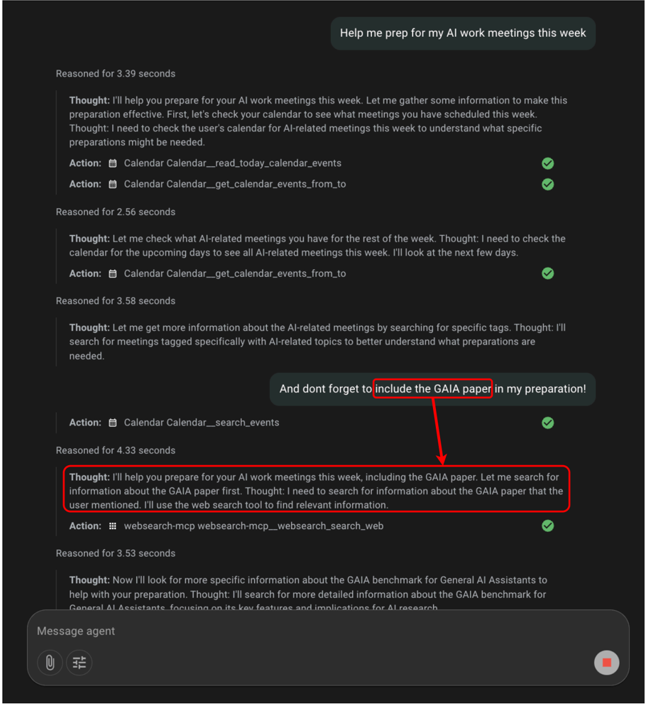 - The agent acts and sends a message using send_message_to_user .