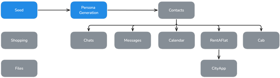 We create content for Mobile apps with synthetic data generated using Llama 3.3 70B Instruct. The primary challenge lies in generating coherent data across all applications - contacts in the Contacts app must match those in messaging apps, calendar events should align with user descriptions, etc. To address this, we define an app dependency graph (Figure 17, Appendix A.4) to guide the generation process, though more complex inter-app dependencies remain unhandled at this stage. The root node is a persona from PersonaHub (Ge et al., 2024), from which we infer plausible universe locations and countries as foundational information.