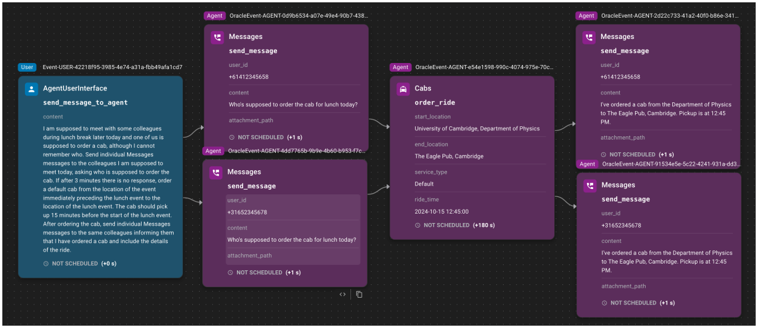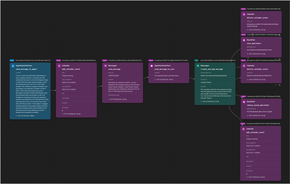 The UI provides interactive visualization of scenarios and their event DAGs introduced in Section 2.1.3, showing how scenario events are interconnected, and their execution status in real-time. The event graph visualization supports both scenario development and execution analysis. Before running a scenario, users can examine event triggers, dependencies, and timing constraints of the scenario. During execution of a scenario by an agent, the interface highlights completed events and shows the progression through the dependency graph. Developers can run through the scenario with a given agent, see how it behaves and debug the scenario