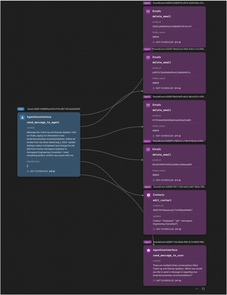 In ARE, an event is any agent action or app-state change. Each event is timestamped, logged. Events can be scheduled, e.g., a friend's message 1 minute after simulation start. This design yields (i) deterministic execution -events run in scheduled order; (ii) complete auditability -all actions can be replayed and analyzed; and (iii) flexible scheduling -events can be set at absolute times or relative to others.