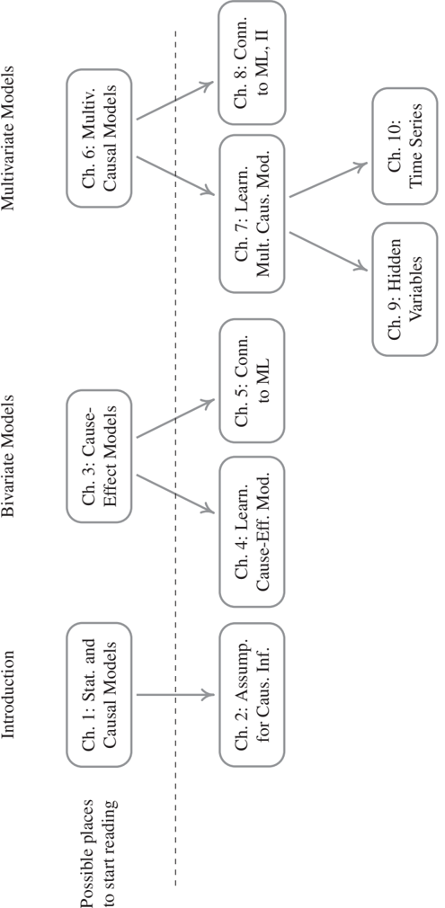 First, the present book represents a bias toward a subproblem of causality that may be considered both the most fundamental and the least realistic. This is the cause-effect problem, where the system under analysis contains only two observables. We have studied this problem in some detail during the last decade. We report much of this work, and try to embed it into a larger context of what we consider fundamental for gaining a selective but profound understanding of the issues of causality. Although it might be instructive to study the bivariate case first, following the sequential chapter order, it is also possible to directly start reading the multivariate chapters; see Figure I.