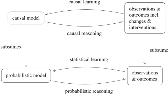 Just like statistical learning denotes the inverse problem to probability theory, we can think about how to infer causal structures from its empirical implications. The empirical implications can be purely observational, but they can also include data under interventions (e.g., randomized trials) or distribution changes. Researchers use various terms to refer to these problems, including structure learning and causal discovery. We refer to the closely related question of which parts of the causal structure can in principle be inferred from the joint distribution as structure identifiability. Unlike the standard problems of statistical learning described in Section 1.2, even full knowledge of P does not make the solution trivial, and we need additional assumptions (see Chapters 2, 4, and 7). This difficulty should not distract us from the fact, however, that the ill-posed-ness of the usual statistical problems is still there (and thus it is important to worry about the capacity of function classes also in causality, such as by using additive noise models - see Section 4.1.4 below), only confounded by an additional difficulty arising from the fact that we are trying to estimate a richer structure than just a probabilistic one. We will refer to this overall problem as causal learning. Figure 1.1 summarizes the relationships between the preceding problems and models.
