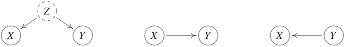 Figure 1.2: Reichenbach's common cause principle establishes a link between statistical properties and causal structures. A statistical dependence between two observables X and Y indicates that they are caused by a variable Z, often referred to as a confounder (left). Here, Z may coincide with either X or Y, in which case the figure simplifies (middle/right). The principle further argues that X and Y are statistically independent, conditional on Z. In this figure, direct causation is indicated by arrows; see Chapters 3 and 6.