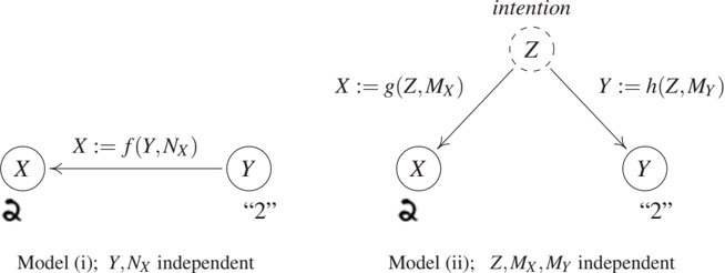 In alternative model (ii), we assume that we do not provide class labels to the writer. Rather, the writer is asked to decide himself or herself which digits to write, and to record the class labels alongside. In this case, both the image X and the recorded class label Y are functions of the writer's intention (call it Z and think of it as a random variable). For generality, we assume that not only the process generating the image is noisy but also the one recording the class label, again with independent noise terms (see Figure 1.3, right). Note that if the functions and noise terms are chosen suitably, we can ensure that this model entails an observational distribution $P_{X,Y}$ that is identical to the one entailed by model (i).