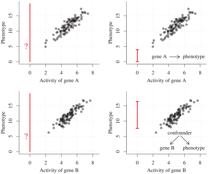 Figure 1.4: The activity of two genes (top: gene A; bottom: gene B) is strongly correlated with the phenotype (black dots). However, the best prediction for the phenotype when deleting the gene, that is, setting its activity to 0 (left), depends on the causal structure (right). If a common cause is responsible for the correlation between gene and phenotype, we expect the phenotype to behave under the intervention as it usually does (bottom right), whereas the intervention clearly changes the value of the phenotype if it is causally influenced by the gene (top right). The idea of this figure is based on Peters et al. [2016].