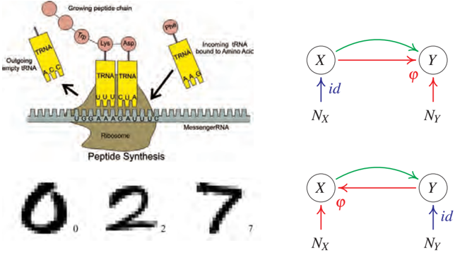 Figure 5.1: Top: a complicated mechanism called the ribosome translates mRNA information X into a protein chain Y. Predicting the protein from the mRNA is an example of a causal learning problem, where the direction of prediction (green arrow) is aligned with the direction of causation (red). Bottom: In handwritten digit recognition, we try to infer the class label Y (i.e., the writer's intention) from an image X produced by a writer. This is an anticausal problem.