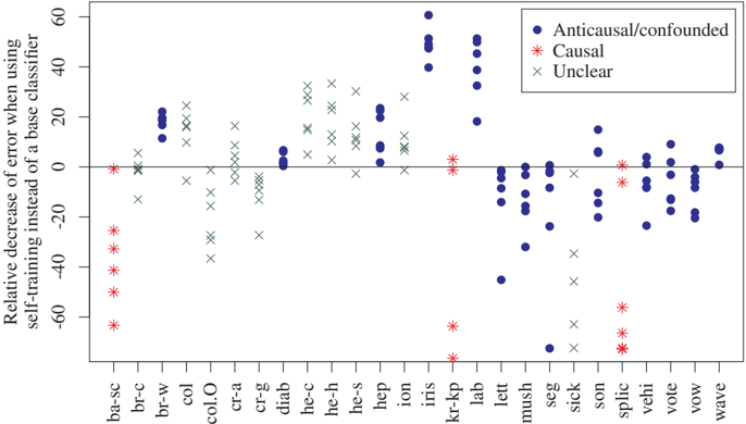 Figure 5.2: The benefit of SSL depends on the causal structure. Each column of points corresponds to a benchmark data set from the UCI repository and shows the performance of six different base classifiers augmented with self-training, a generic method for SSL. Performance is measured by percentage decrease of error relative to the base classifier, that is, (error(base) - error(self-train))/error(base). Self-training overall does not help for the causal data sets, but it does help for some of the anticausal/confounded data sets [from Schölkopf et al., 2012].