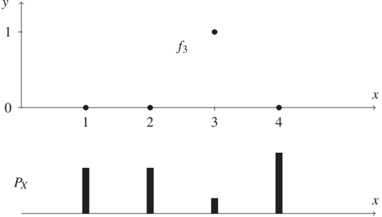 To see this, consider a toy example where the relation between X and Y is given by a deterministic function, that is, Y = f(X), where f is known to be from some class F of functions. Let X take values in {1, ..., m} with m ≥ 3 and let Y be a binary label attaining values in {0, 1}. We define the function class F := {f₁, ..., fₘ} by fⱼ(j) = 1 and fⱼ(k) = 0 for k ≠ j. In other words, F consists of the set of functions that attain the value one at exactly one point. Figure 5.3, top, shows the function f₃ for m = 4. Suppose that our learning algorithm infers fⱼ while the true function is fᵢ. For i ≠ j, the risk, that is, the expected number of errors (see Equation (1.2)), equals