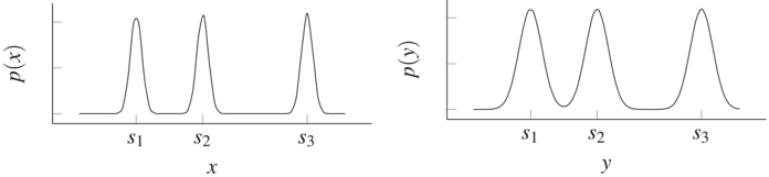 Figure 5.5: Example where X causes Y and, as a result, P(Y) and P(X|Y) contain information about each other. Left: P(X) is a mixture of sharp peaks at the positions s₁, s₂, s₃. Right: P(Y) is obtained from P(X) by convolution with Gaussian noise with zero mean and thus consists of less sharp peaks at the same positions s₁, s₂, s₃. Then P(X|Y) also contains information about s₁, s₂, s₃ (see Problem 5.1).