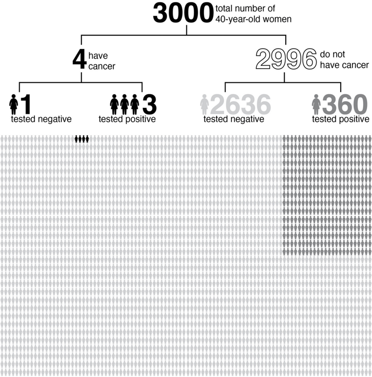 The conflict between our perception and reality partially explains the outcry when the US Preventive Services Task Force, in 2009, recommended that forty-year-old women should not get annual mammograms. The task force understood what many women did not: a positive test at that age is way more likely to be a false alarm than to detect cancer, and many women were unnecessarily terrified (and getting unnecessary treatment) as a result.