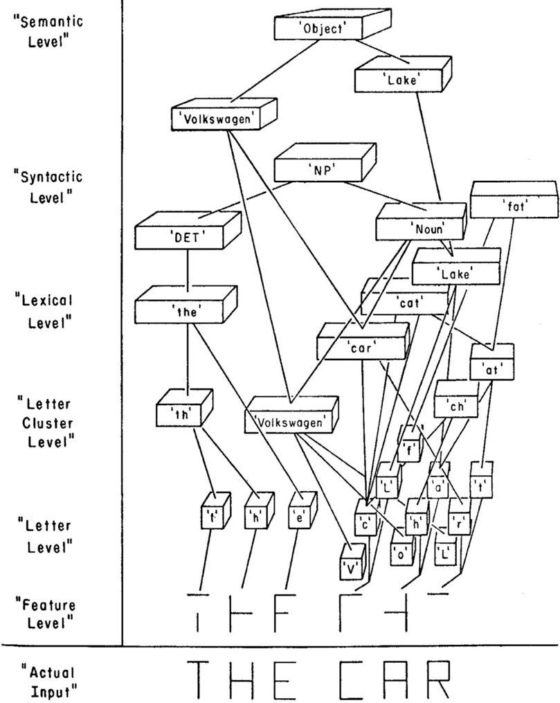 The idea did not come to me in a dream; it came from an article by David Rumelhart, a cognitive scientist at University of California, San Diego, and a pioneer of neural networks. His article about children's reading, published in 1976, made clear that reading is a complex process in which neurons on many different levels are active at the same time (see Figure 3.4). Some of the neurons are simply recognizing individual features-circles or lines. Above them, another layer of neurons is combining these shapes and forming conjectures about what the letter might be. In Figure 3.4, the network is struggling with a great deal of ambiguity about the second word. At the letter level, it could be 'FHP,' but that doesn't make much sense at the word level. At the word level it could be 'FAR' or 'CAR' or 'FAT.' The neurons pass this information up to the syntactic level, which decides that after the word 'THE,' it's expecting a noun. Finally this information gets passed all the way up to the semantic level, which realizes that the previous sentence mentioned a Volkswagen, so the phrase is likely to be 'THE CAR,' referring to that same Volkswagen. The key point is that all the neurons are passing information back and forth, from the top down and from the bottom up and from side to side. It's a highly parallel system, and one that is quite different from our self-perception of the brain as a monolithic, centrally controlled system.