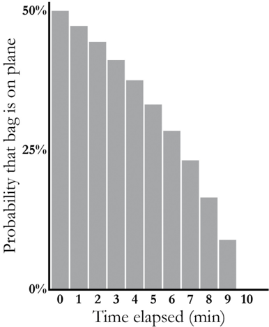 FIGURE 3.6. The probability of seeing your bag on the carousel decreases slowly at first, then more rapidly. ( Source: Graph by Maayan Harel, data from Stefan Conrady and Lionel Jouffe.)