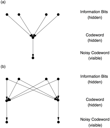 FIGURE 3.9. (a) Bayesian network representation of ordinary coding process. Information bits are transformed into codewords; these are transmitted and received at the destination with noise (errors). (b) Bayesian network representation of turbo code. Information bits are scrambled and encoded twice. Decoding proceeds by belief propagation on this network. Each processor at the bottom uses information from the other processor to improve its guess of the hidden codeword,