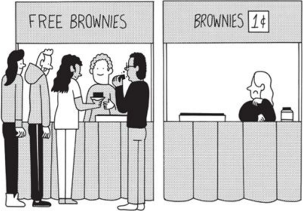 Even if you start low and go up over time, it is important to charge something. There is a very large difference between free and one dollarthat's the zero price effect . As behavioral economist Dan Ariely writes in Predictably Irrational , 'people will jump for something free even when it's something they don't want.' He uses the example of a long line of college students waiting for free, terribly unhealthy brownies. Asked to pay even just one cent, the line of kids disappears.