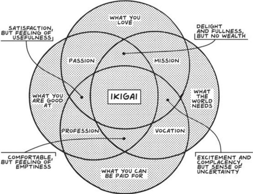 I believe our goal should be to bring together our passions, our missions, our professions, and our vocations. This is the Japanese concept of ikigai , which aligns what you love, with what the world needs, with what you can be paid for, and with what you are good at: